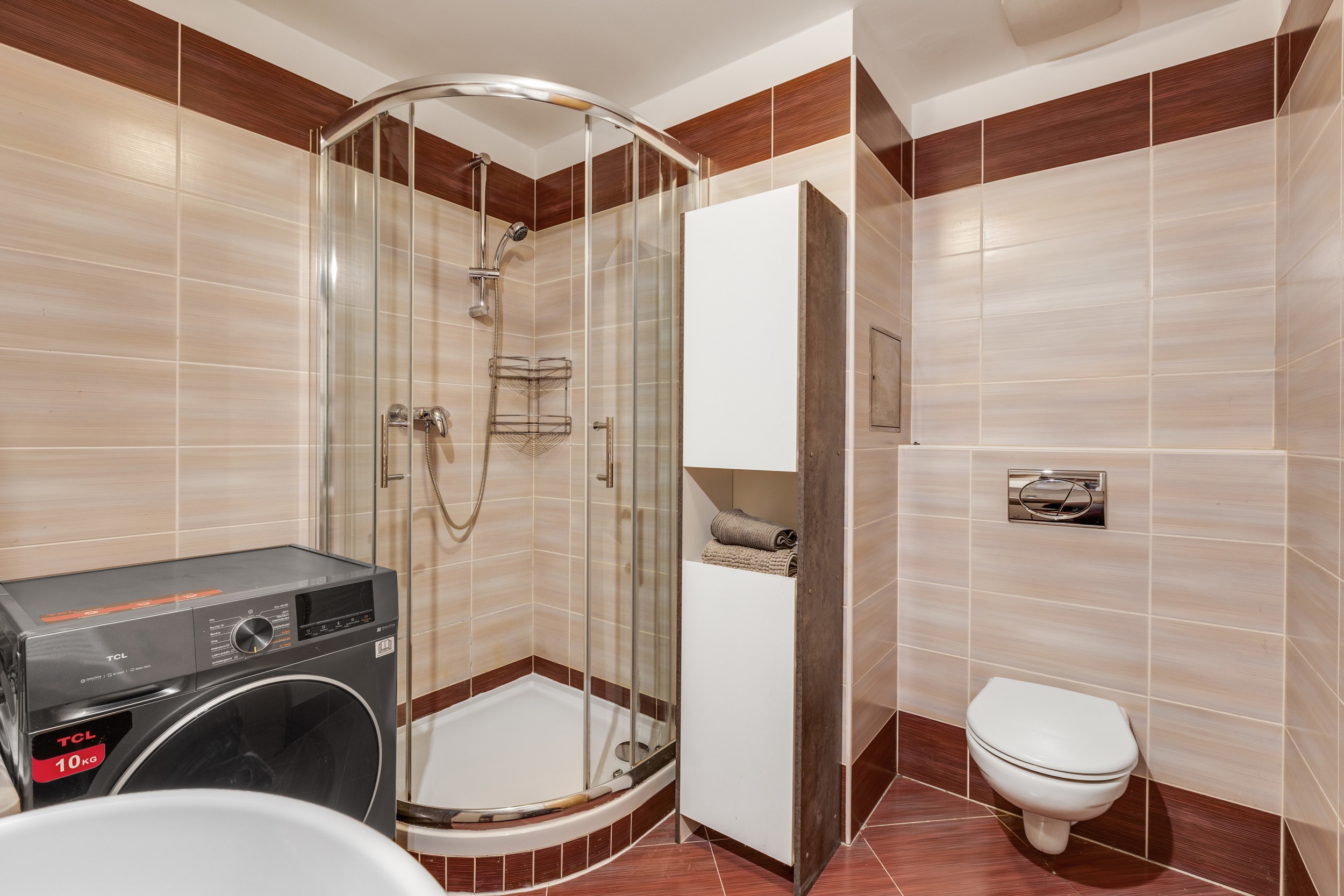 Koupelna se sprchovým koutem a wc.