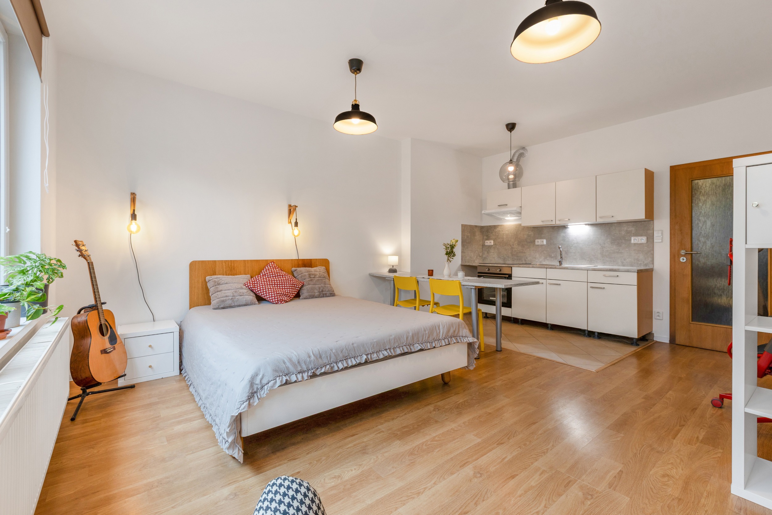 Obytná místnost je dostatečně prostorná na manželskou postel, jídelní kout s kuchyní, ale i pracovní zónu.