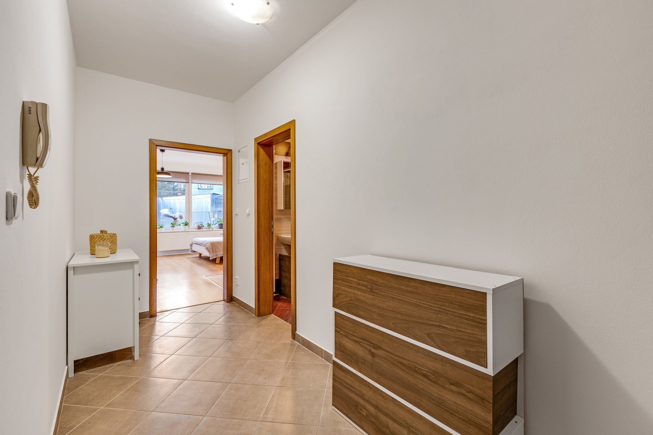 Jednotka, která prošla tento měsíc revitalizací, se nachází ve zvýšeném přízemí. Stejně jako prostorná komora, která je praktickým bonusem pro budoucí majitele, kteří díky ní budou mít dostatek úložného prostoru.